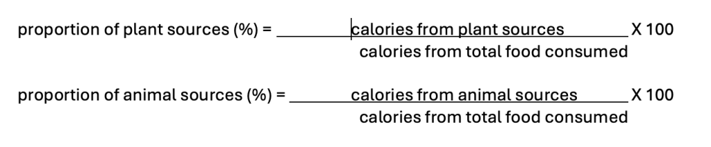 Explore the Trophic Level Efficiency of Your Diet: Based on your 4-day food audit (from Datasheet 1), calculate the proportion of your diet that is derived from plant sources and the proportion that is derived from animal sources. Report both proportions as percentages. To calculate the proportions, follow the formula provided below and show your work: